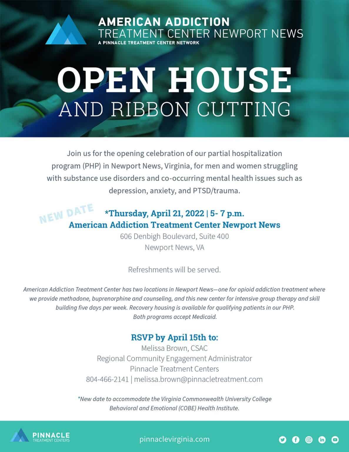 Join us for the opening celebration of our partial hospitalization program (PHP) in Newport News, Virginia, for men and women struggling with substance use disorders and co-occurring mental health issues such as depression, anxiety, and PTSD/trauma.